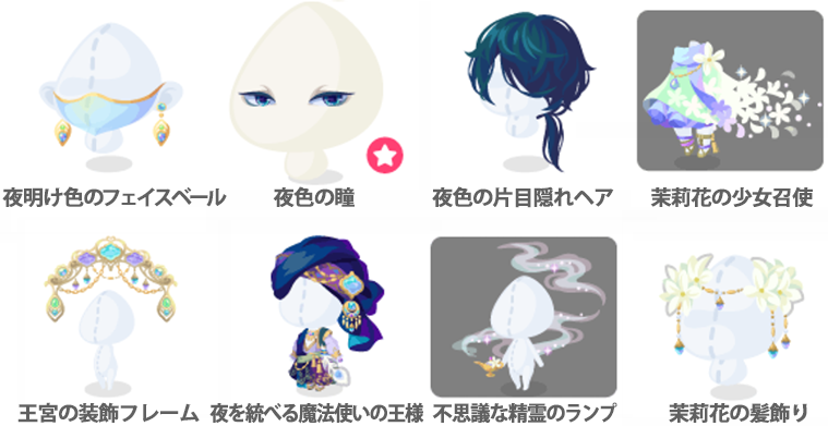 ★亜麻色のアレンジロング ★いつくしむ夜明け色の瞳(顔パーツ) ☆夜明けを映すベール ☆異国からきた姫君 ☆宝石の踊り子 夜明け色のフェイスベール 夜色の瞳(顔パーツ) 夜色の片目隠れヘア 茉莉花の少女召使 王宮の装飾フレーム 夜を統べる魔法使いの王様 不思議な精霊のランプ 茉莉花の髪飾り