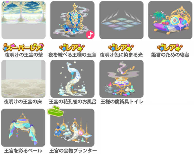 ★夜明けの王宮の壁 ☆夜を統べる王様の玉座(ネイロアイテム) ☆夜明け色に染まる光 ☆姫君のための寝台 夜明けの王宮の床 王宮の花孔雀のお風呂 王様の魔術具トイレ 王宮を彩るベール 王宮の宝物プランター