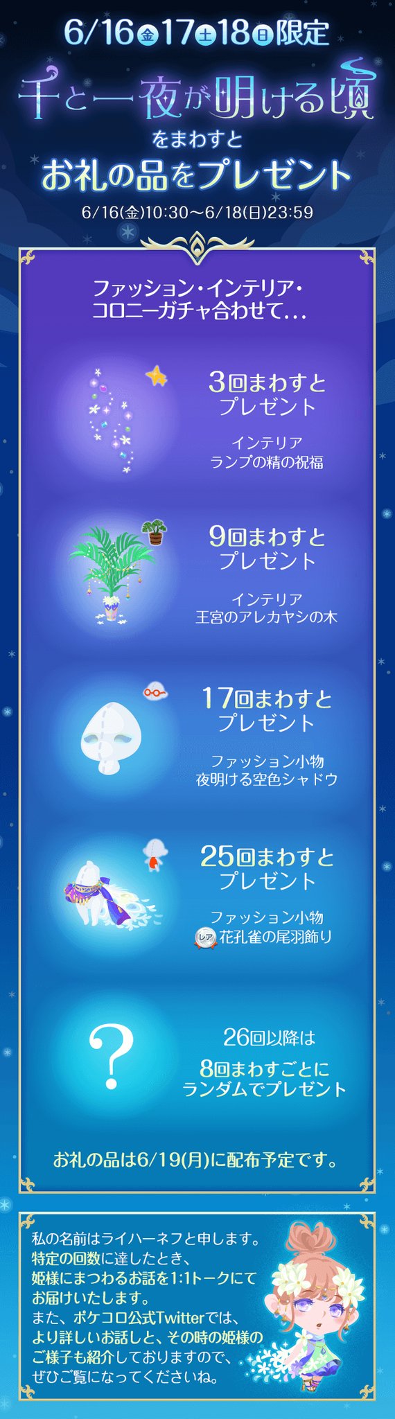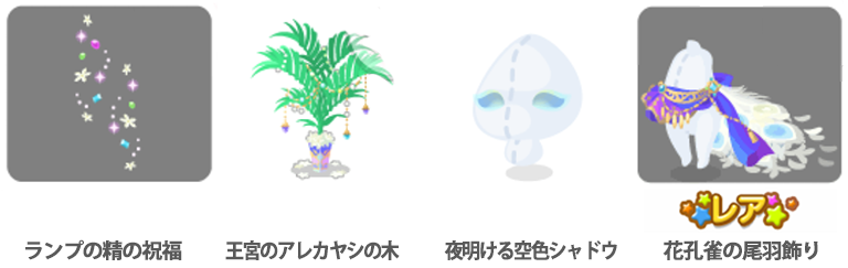 ランプの精の祝福(i)3回 王宮のアレカヤシの木(i)9回 夜明ける空色シャドウ(f)17回 ☆花孔雀の尾羽飾り(f)25回