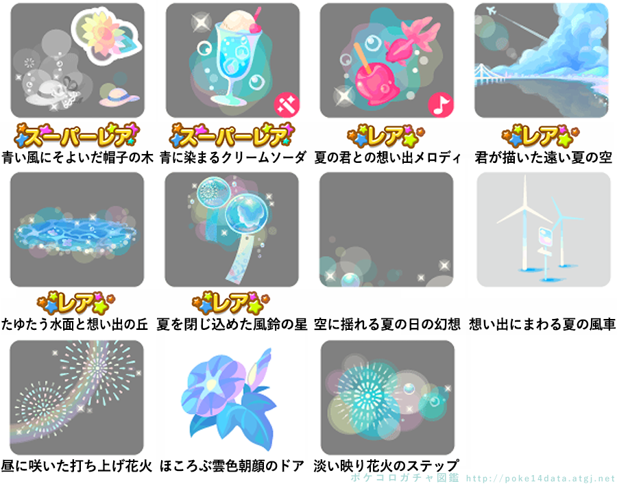 ★青い風にそよいだ帽子の木 No.1409 青に染まる和風ゼリー寄せ 想い出輝くコサージュの実 ★青に染まるクリームソーダ(フィルターアイテム) ☆夏の君との想い出メロディ(Cネイロアイテム) ☆君が描いた遠い夏の空 ☆たゆたう水面と想い出の丘 ☆夏を閉じ込めた風鈴の星 空に揺れる夏の日の幻想 想い出にまわる夏の風車 昼に咲いた打ち上げ花火 ほころぶ雲色朝顔のドア 淡い映り花火のステップ