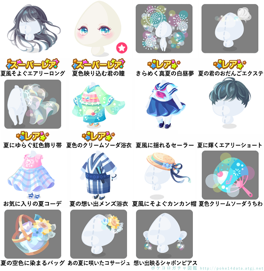 ★夏風そよぐエアリーロング ★夏色映り込む君の瞳(顔パーツ) ☆きらめく真夏の白昼夢 ☆夏の君のおだんごエクステ ☆夏にゆらぐ虹色飾り帯 ☆夏色のクリームソーダ浴衣 夏風に揺れるセーラー 夏に輝くエアリーショート お気に入りの夏コーデ 夏の想い出メンズ浴衣 夏風にそよぐカンカン帽 夏色クリームソーダうちわ 夏の空色に染まるバッグ あの夏に咲いたコサージュ 想い出映るシャボンピアス