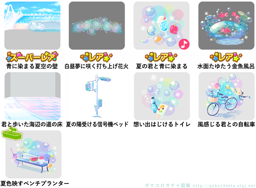 ★青に染まる夏空の壁 ☆白昼夢に咲く打ち上げ花火 ☆夏の君と青に染まる(ネイロアイテム) ☆水面たゆたう金魚風呂 君と歩いた海辺の道の床 夏の陽受ける信号機ベッド 想い出はじけるトイレ 風感じる君との自転車 夏色映すベンチプランター