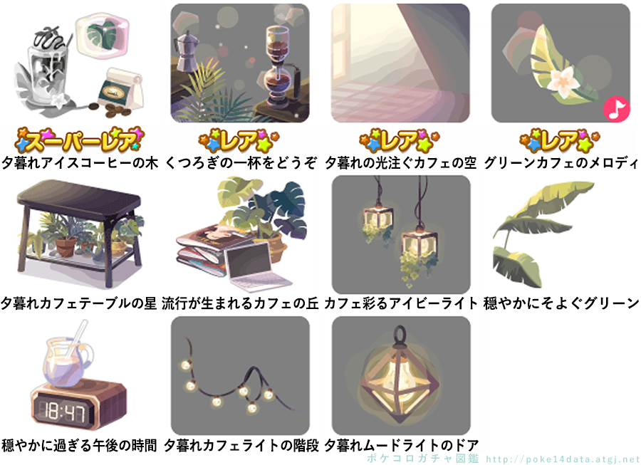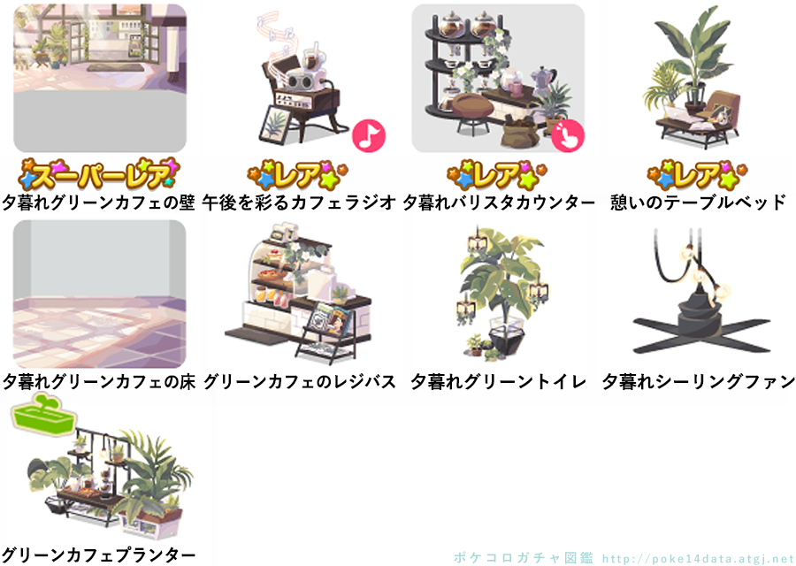 ★夕暮れグリーンカフェの壁 ☆午後を彩るカフェラジオ(ネイロアイテム) ☆夕暮れバリスタカウンター(アクションアイテム) ☆憩いのテーブルベッド 夕暮れグリーンカフェの床 グリーンカフェのレジバス 夕暮れグリーントイレ 夕暮れシーリングファン グリーンカフェプランター