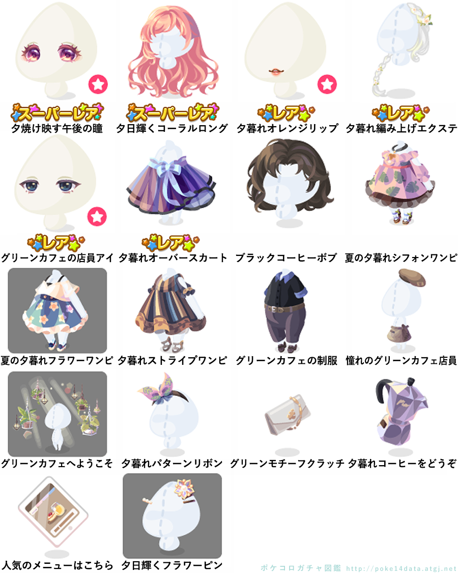 ★夕焼け映す午後の瞳(顔パーツ) ★夕日輝くコーラルロング ☆夕暮れオレンジリップ(顔パーツ) ☆夕暮れ編み上げエクステ ☆グリーンカフェの店員アイ(顔パーツ) ☆夕暮れオーバースカート ブラックコーヒーボブ 夏の夕暮れシフォンワンピ 夏の夕暮れフラワーワンピ 夕暮れストライプワンピ グリーンカフェの制服 憧れのグリーンカフェ店員 グリーンカフェへようこそ 夕暮れパターンリボン グリーンモチーフクラッチ 夕暮れコーヒーをどうぞ 人気のメニューはこちら 夕日輝くフラワーピン