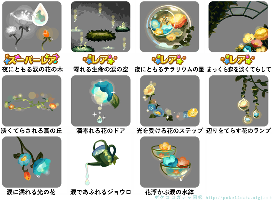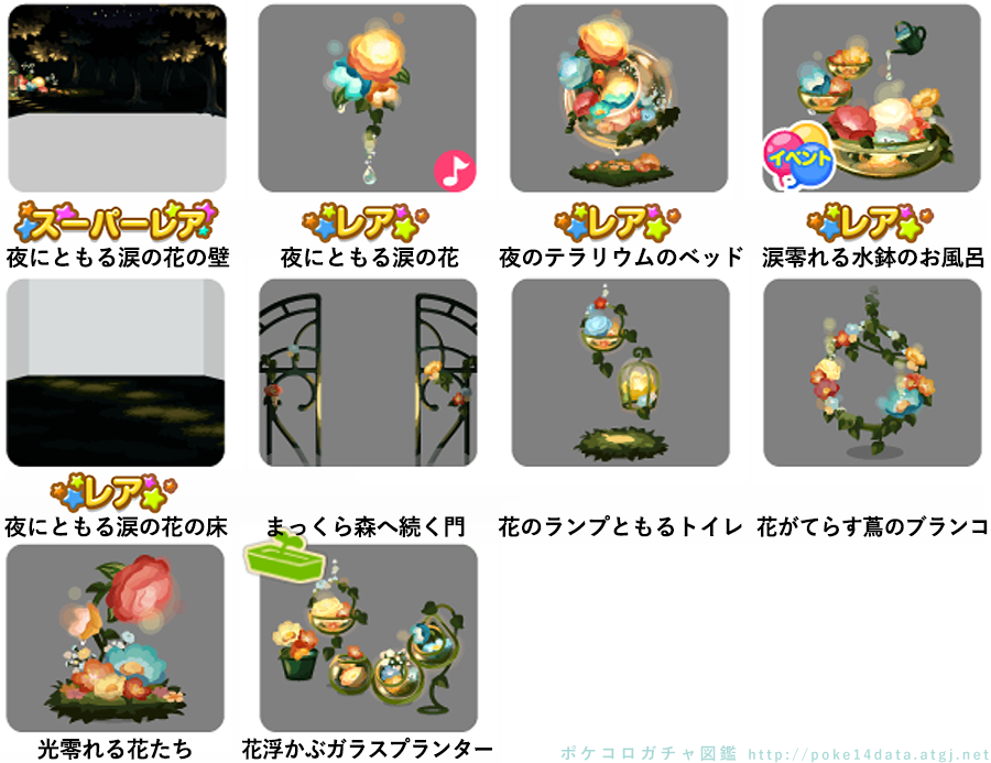 ★夜にともる涙の花の壁 ☆夜にともる涙の花(ネイロアイテム) ☆夜のテラリウムのベッド ☆涙零れる水鉢のお風呂(イベント関連アイテム) ☆夜にともる涙の花の床 まっくら森へ続く門 花のランプともるトイレ 花がてらす蔦のブランコ 光零れる花たち 花浮かぶガラスプランター