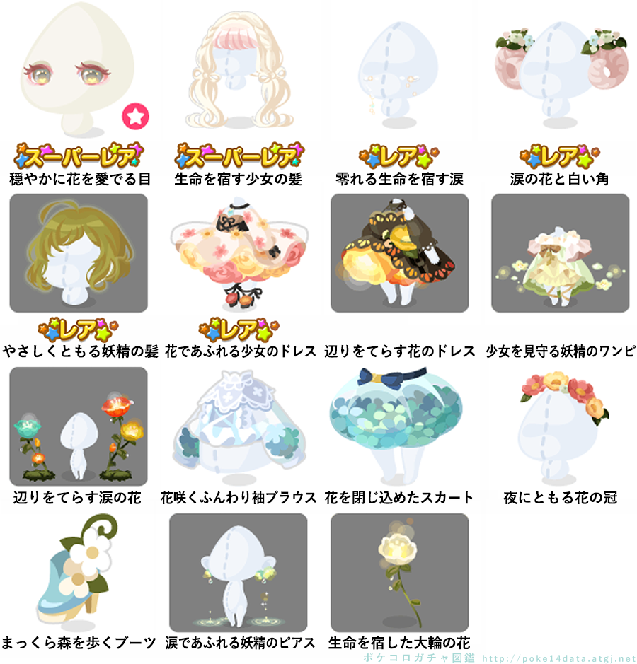 ★穏やかに花を愛でる目(顔パーツ) ★生命を宿す少女の髪 ☆零れる生命を宿す涙 ☆涙の花と白い角 ☆やさしくともる妖精の髪 ☆花であふれる少女のドレス 辺りをてらす花のドレス 少女を見守る妖精のワンピ 辺りをてらす涙の花 花咲くふんわり袖ブラウス 花を閉じ込めたスカート 夜にともる花の冠 まっくら森を歩くブーツ 涙であふれる妖精のピアス 生命を宿した大輪の花