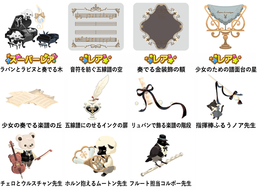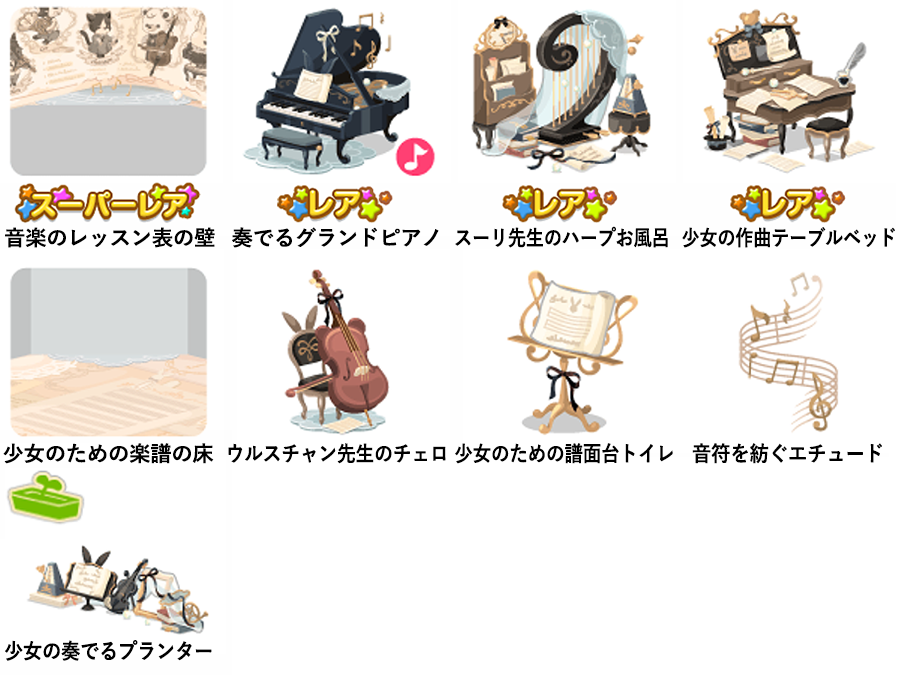 ★音楽のレッスン表の壁 ☆奏でるグランドピアノ(ネイロアイテム) ☆スーリ先生のハープお風呂 ☆少女の作曲テーブルベッド 少女のための楽譜の床 ウルスチャン先生のチェロ 少女のための譜面台トイレ 音符を紡ぐエチュード 少女の奏でるプランター