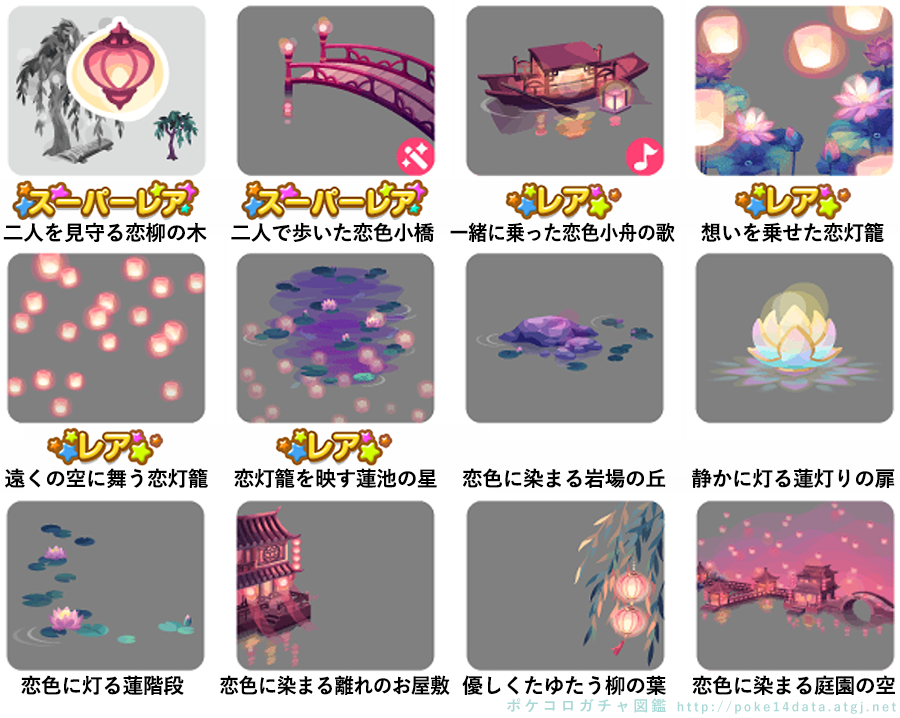 ★二人を見守る恋柳の木 No.1383 想いを寄せ合う生春巻き 二人を見守る恋提灯の実 ★二人で歩いた恋色小橋(フィルターアイテム) ☆一緒に乗った恋色小舟の歌(Cネイロアイテム) ☆想いを乗せた恋灯籠 ☆遠くの空に舞う恋灯籠 ☆恋灯籠を映す蓮池の星 恋色に染まる岩場の丘 静かに灯る蓮灯りの扉 恋色に灯る蓮階段 恋色に染まる離れのお屋敷 優しくたゆたう柳の葉 恋色に染まる庭園の空