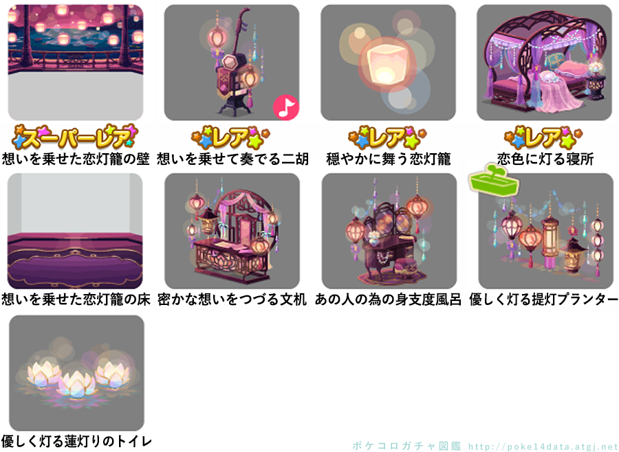 ★想いを乗せた恋灯籠の壁 ☆想いを乗せて奏でる二胡(ネイロアイテム) ☆穏やかに舞う恋灯籠 ☆恋色に灯る寝所 想いを乗せた恋灯籠の床 密かな想いをつづる文机 あの人の為の身支度風呂 優しく灯る提灯プランター 優しく灯る蓮灯りのトイレ