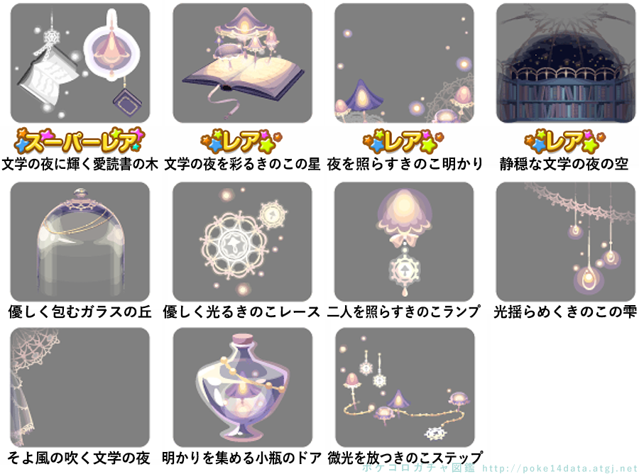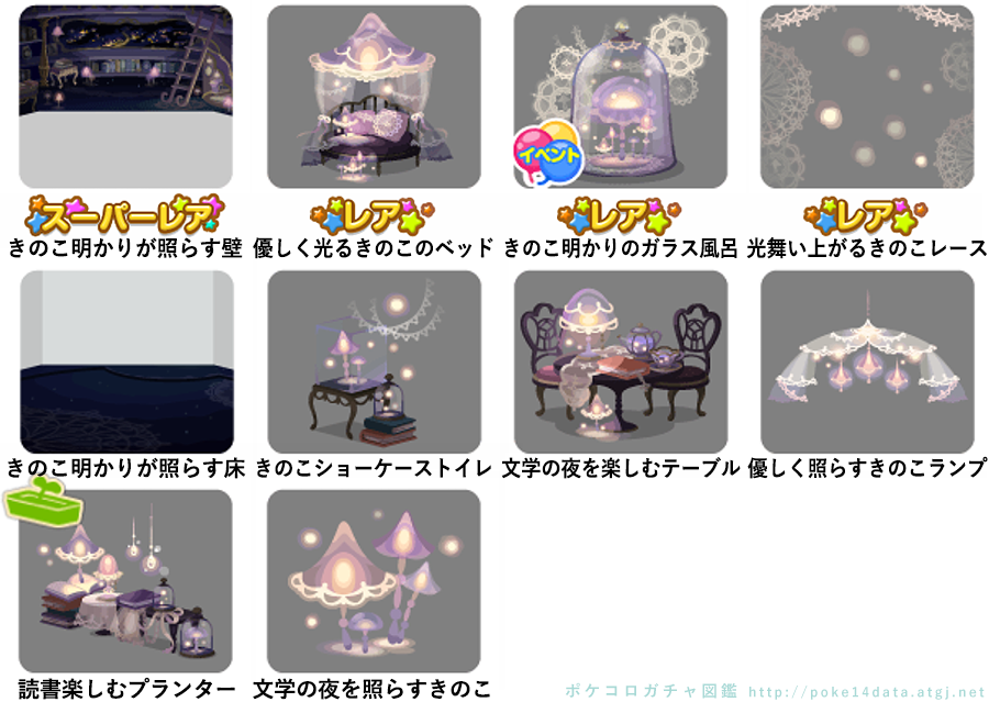 ★きのこ明かりが照らす壁 ☆優しく光るきのこのベッド ☆きのこ明かりのガラス風呂(イベント関連アイテム) ☆光舞い上がるきのこレース きのこ明かりが照らす床 きのこショーケーストイレ 文学の夜を楽しむテーブル 優しく照らすきのこランプ 読書楽しむプランター 文学の夜を照らすきのこ