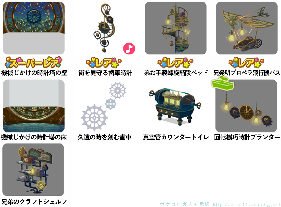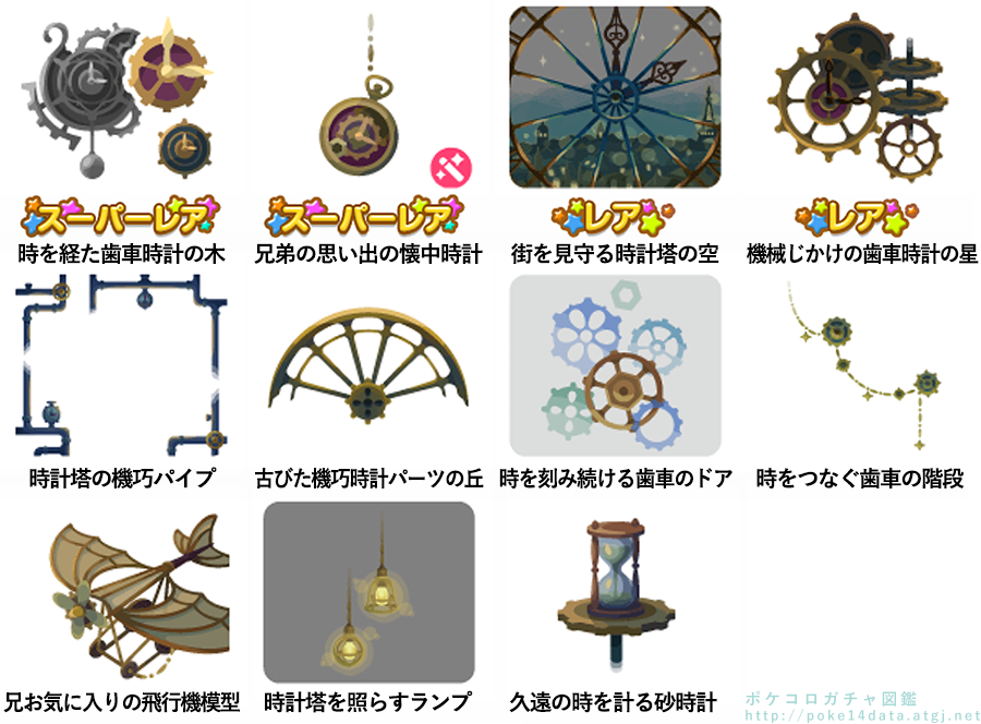 ★時を経た歯車時計の木 No.1294 夜を映す歯車サワー 時を刻む歯車の実 ★兄弟の思い出の懐中時計(フィルターアイテム) ☆街を見守る時計塔の空 ☆機械じかけの歯車時計の星 時計塔の機巧パイプ 古びた機巧時計パーツの丘 時を刻み続ける歯車のドア 時をつなぐ歯車の階段 兄お気に入りの飛行機模型 時計塔を照らすランプ 久遠の時を計る砂時計