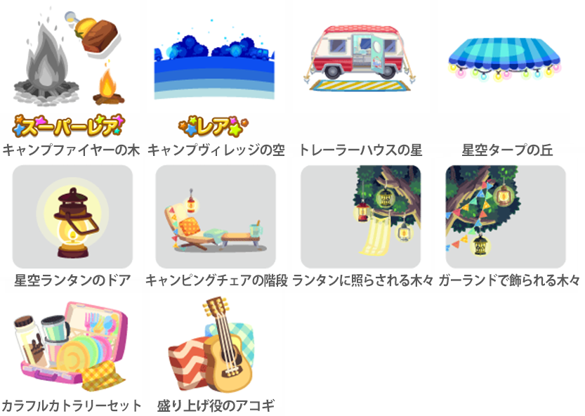 ★キャンプファイヤーの木 No.1029 ファイヤー青椒肉絲 ファイヤー串焼きの実 ☆キャンプヴィレッジの空 トレーラーハウスの星 星空タープの丘 星空ランタンのドア キャンピングチェアの階段 ランタンに照らされる木々 ガーランドで飾られる木々 カラフルカトラリーセット 盛り上げ役のアコギ