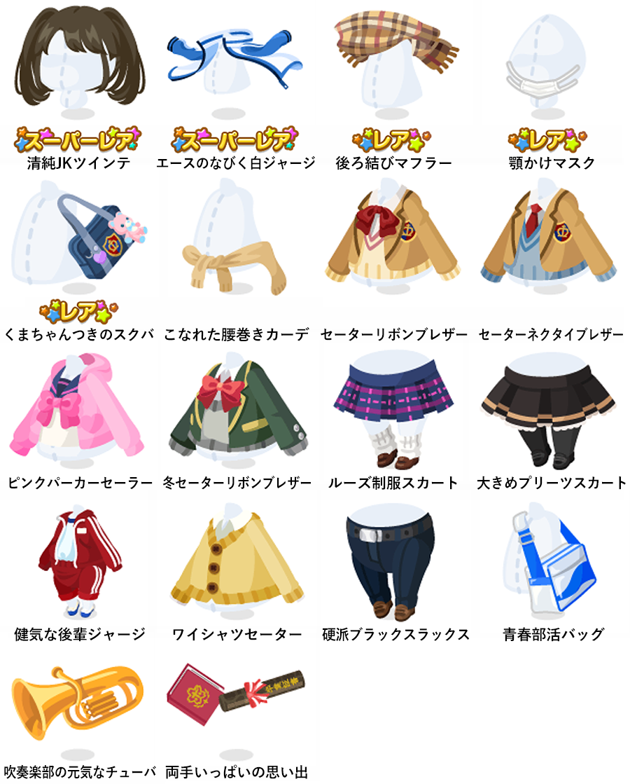★清純JKツインテ ★エースのなびく白ジャージ ☆後ろ結びマフラー ☆顎かけマスク ☆くまちゃんつきのスクバ こなれた腰巻きカーデ セーターリボンブレザー セーターネクタイブレザー ピンクパーカーセーラー 冬セーターリボンブレザー ルーズ制服スカート 大きめプリーツスカート 健気な後輩ジャージ ワイシャツセーター 硬派ブラックスラックス 青春部活バッグ 吹奏楽部の元気なチューバ 両手いっぱいの思い出