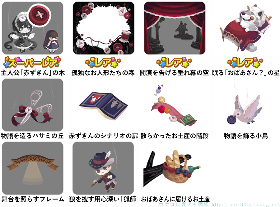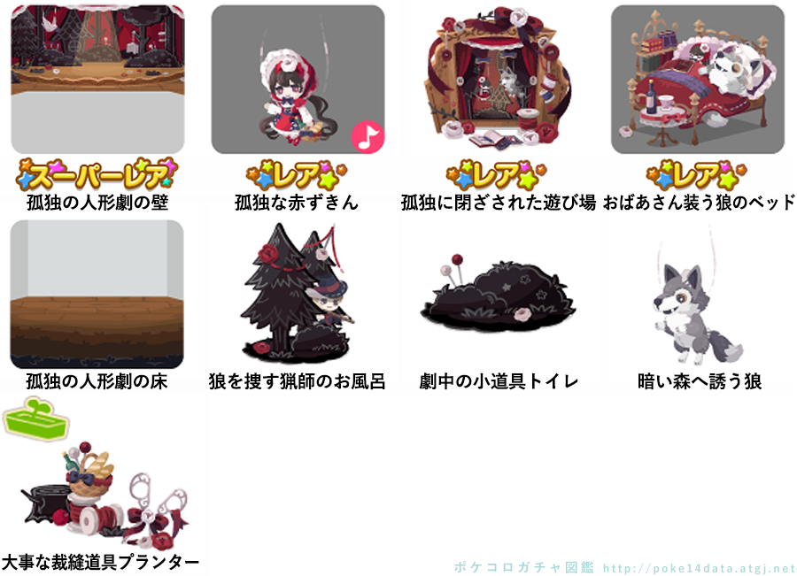 ★孤独の人形劇の壁 ☆孤独な赤ずきん(ネイロアイテム) ☆孤独に閉ざされた遊び場 ☆おばあさん装う狼のベッド 孤独の人形劇の床 狼を捜す猟師のお風呂 劇中の小道具トイレ 暗い森へ誘う狼 大事な裁縫道具プランター