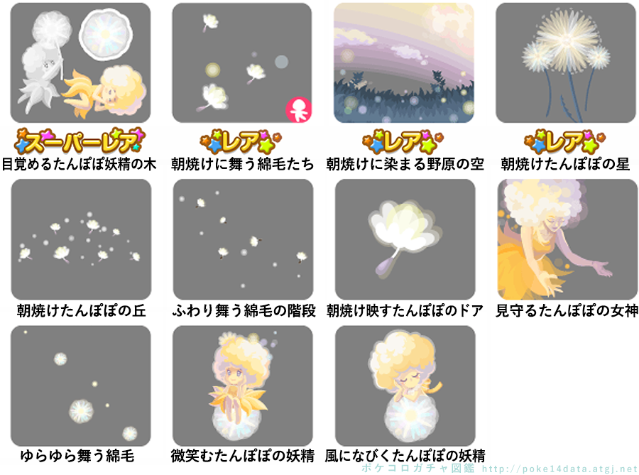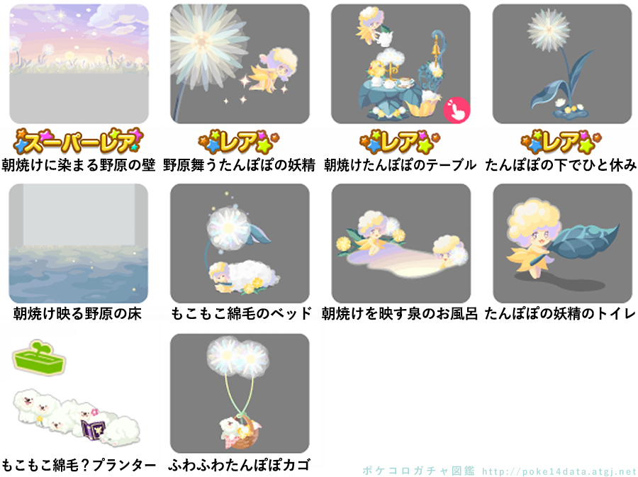 ★朝焼けに染まる野原の壁 ☆野原舞うたんぽぽの妖精 ☆朝焼けたんぽぽのテーブル(アクションアイテム) ☆たんぽぽの下でひと休み 朝焼け映る野原の床 もこもこ綿毛のベッド 朝焼けを映す泉のお風呂 たんぽぽの妖精のトイレ もこもこ綿毛?プランター ふわふわたんぽぽカゴ