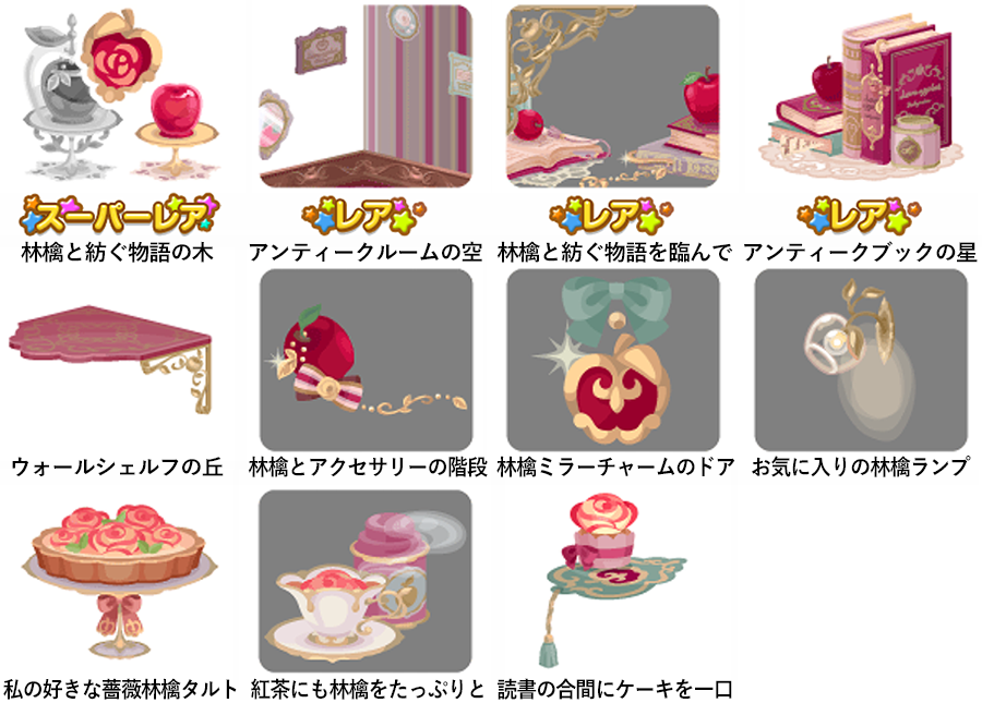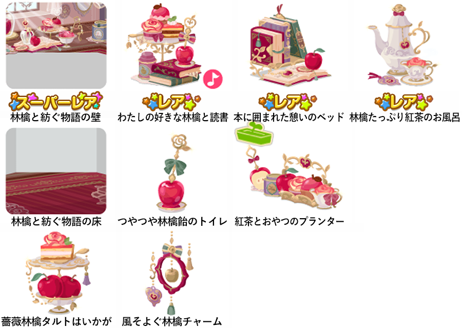 ★林檎と紡ぐ物語の壁 ☆わたしの好きな林檎と読書(ネイロアイテム) ☆本に囲まれた憩いのベッド ☆林檎たっぷり紅茶のお風呂 林檎と紡ぐ物語の床 つやつや林檎飴のトイレ 紅茶とおやつのプランター 薔薇林檎タルトはいかが 風そよぐ林檎チャーム