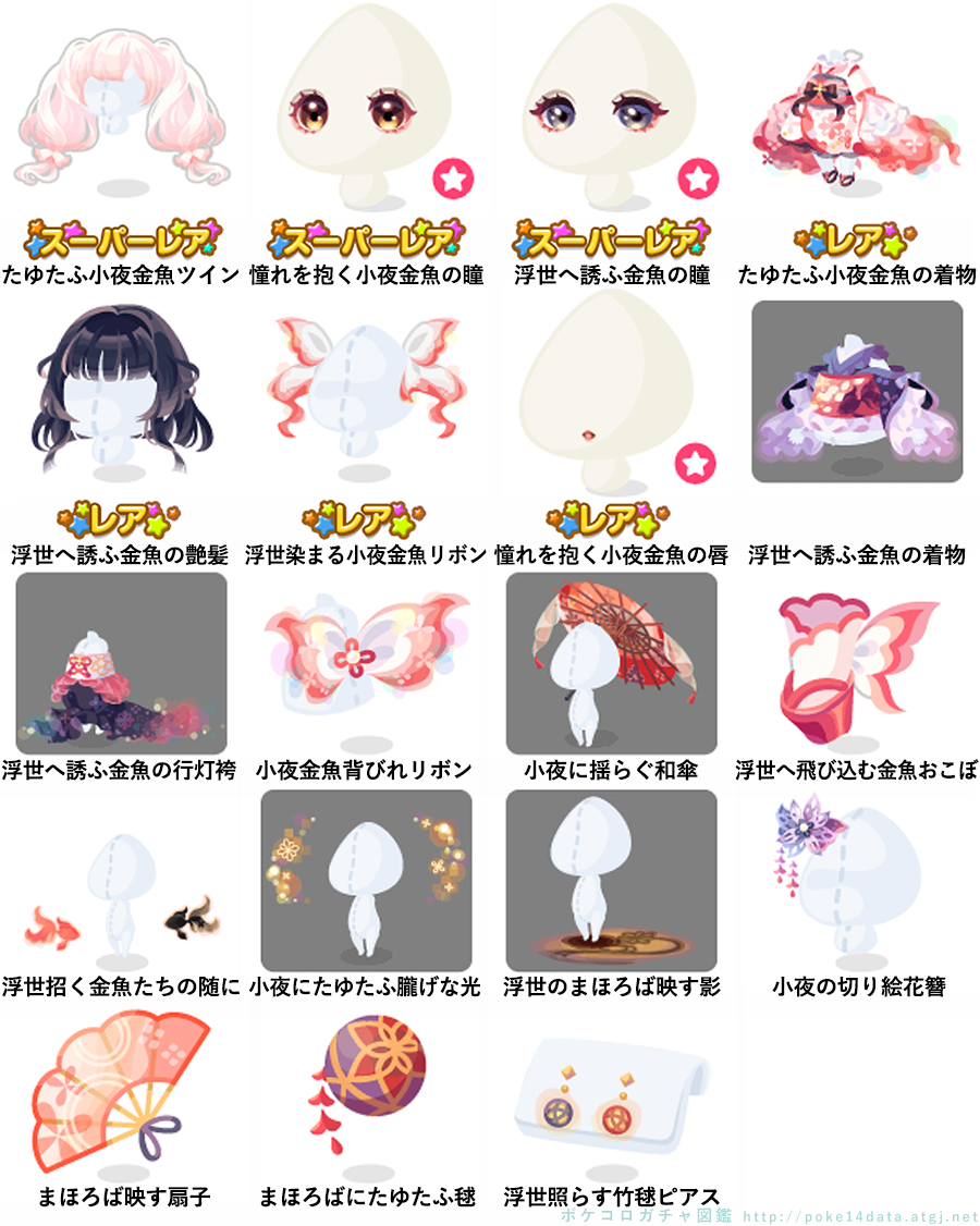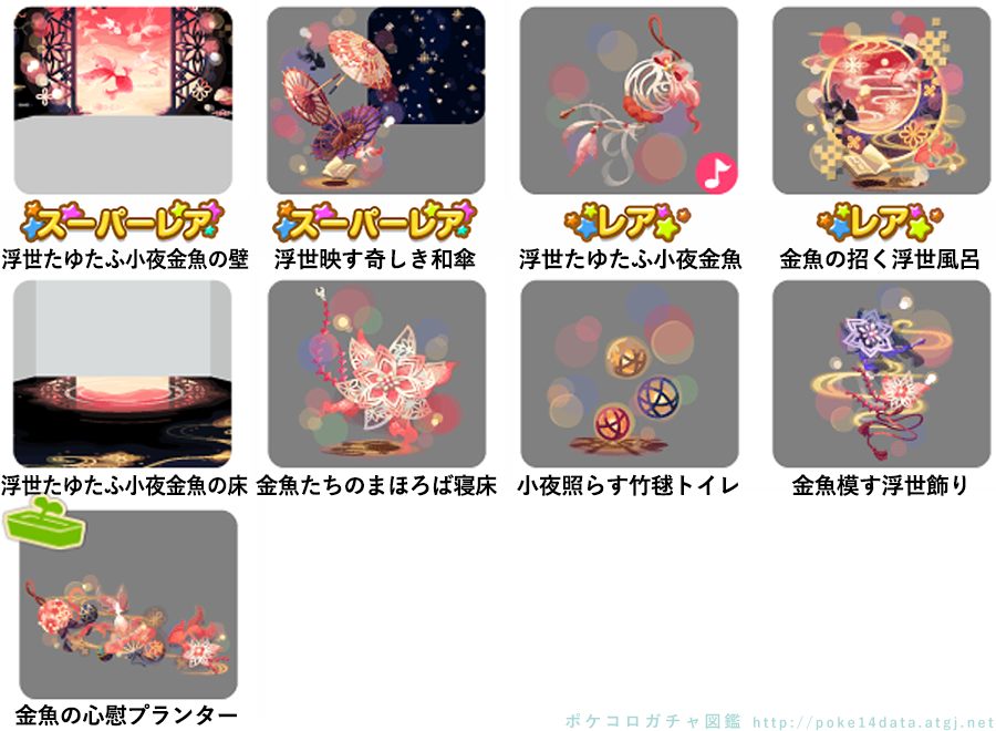 ★浮世たゆたふ小夜金魚の壁 ★浮世映す奇しき和傘(パターンアイテム) ☆浮世たゆたふ小夜金魚(ネイロアイテム) 金魚の招く浮世風呂 浮世たゆたふ小夜金魚の床 金魚たちのまほろば寝床 小夜照らす竹毬トイレ 金魚模す浮世飾り 金魚の心慰プランター