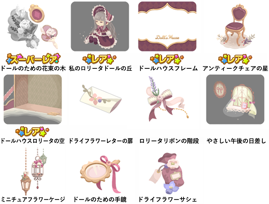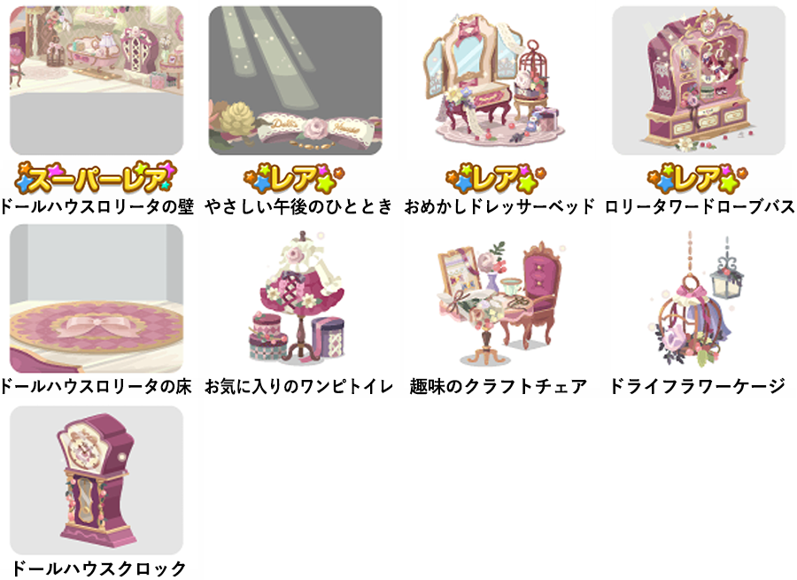 ★ドールハウスロリータの壁 ☆やさしい午後のひととき ☆おめかしドレッサーベッド ☆ロリータワードローブバス ドールハウスロリータの床 お気に入りのワンピトイレ 趣味のクラフトチェア ドライフラワーケージ ドールハウスクロック