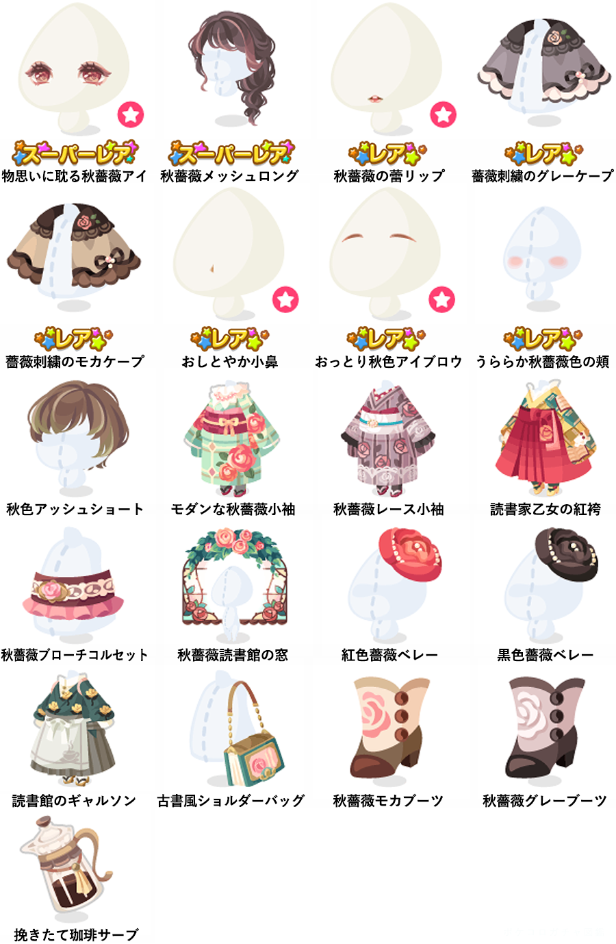 ★物思いに耽る秋薔薇アイ(顔パーツ) ★秋薔薇メッシュロング ☆秋薔薇の蕾リップ(顔パーツ) ☆薔薇刺繍のグレーケープ ☆薔薇刺繍のモカケープ ☆おしとやか小鼻(顔パーツ) ☆おっとり秋色アイブロウ(顔パーツ) ☆うららか秋薔薇色の頬 秋色アッシュショート モダンな秋薔薇小袖 秋薔薇レース小袖 読書家乙女の紅袴 秋薔薇ブローチコルセット 秋薔薇読書館の窓 紅色薔薇ベレー 黒色薔薇ベレー 読書館のギャルソン 古書風ショルダーバッグ 秋薔薇モカブーツ 秋薔薇グレーブーツ 挽きたて珈琲サーブ