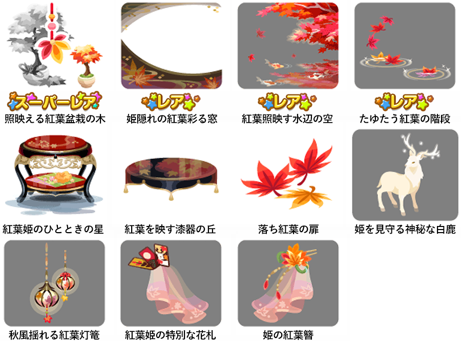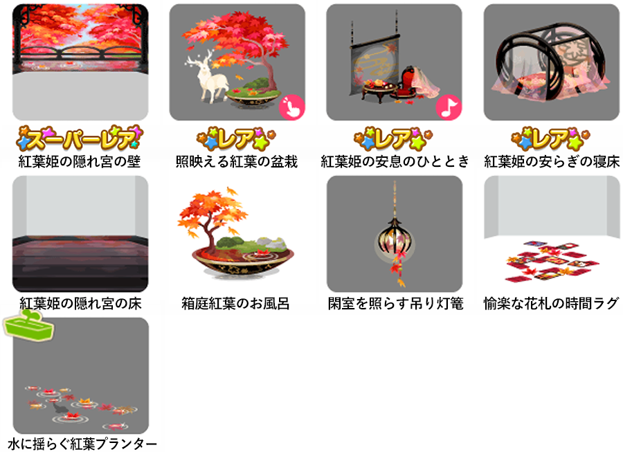 ★紅葉姫の隠れ宮の壁 ☆照映える紅葉の盆栽(アクションアイテム) ☆紅葉姫の安息のひととき(ネイロアイテム) ☆紅葉姫の安らぎの寝床 紅葉姫の隠れ宮の床 箱庭紅葉のお風呂 閑室を照らす吊り灯篭 愉楽な花札の時間ラグ 水に揺らぐ紅葉プランター