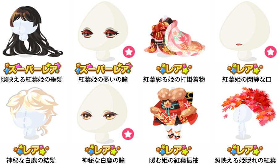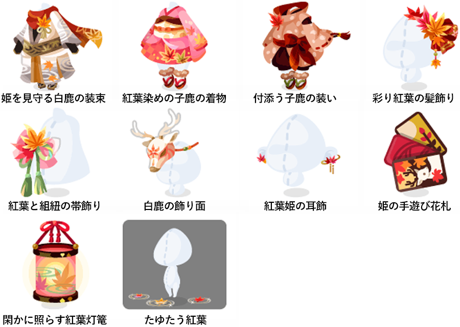 ★照映える紅葉姫の垂髪 ★紅葉姫の憂いの瞳(顔パーツ) ☆紅葉彩る姫の打掛着物 ☆紅葉姫の閑静な口(顔パーツ) ☆神秘な白鹿の結髪 ☆神秘な白鹿の瞳(顔パーツ) ☆暖む姫の紅葉振袖 ☆照映える姫隠れの紅葉 姫を見守る白鹿の装束 紅葉染めの子鹿の着物 付添う子鹿の装い 彩り紅葉の髪飾り 紅葉と組紐の帯飾り 白鹿の飾り面 紅葉姫の耳飾 姫の手遊び花札 閑かに照らす紅葉灯篭 たゆたう紅葉