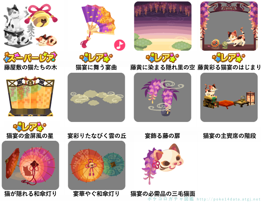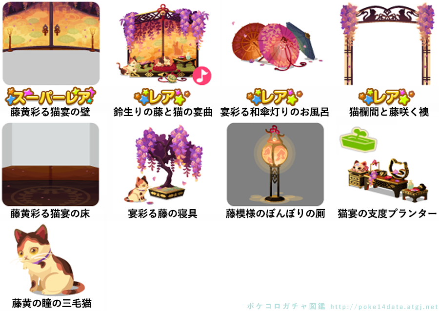 ★藤黄彩る猫宴の壁 ☆鈴生りの藤と猫の宴曲(ネイロアイテム) ☆宴彩る和傘灯りのお風呂 ☆猫欄間と藤咲く襖 藤黄彩る猫宴の床 宴彩る藤の寝具 藤模様のぼんぼりの厠 猫宴の支度プランター 藤黄の瞳の三毛猫