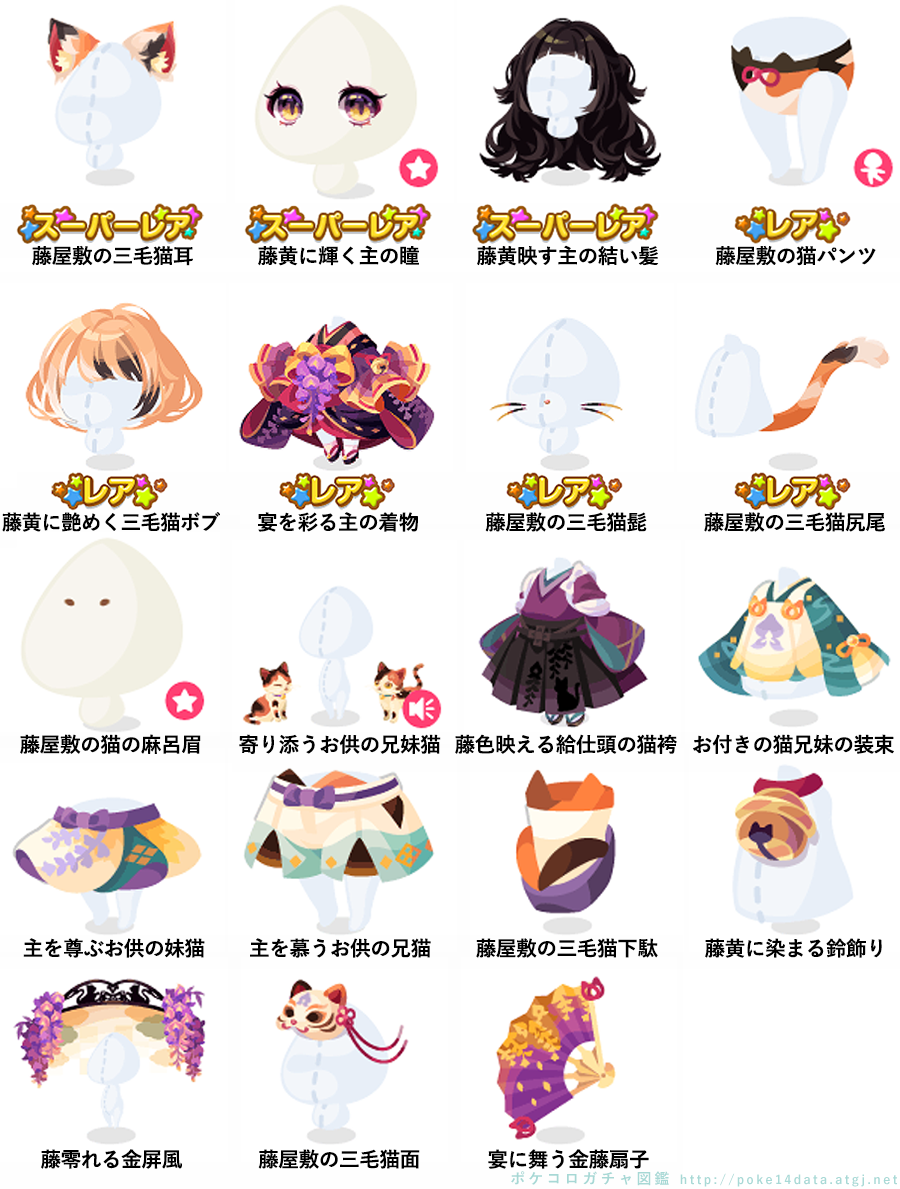 ★藤屋敷の三毛猫耳 ★藤黄に輝く主の瞳(顔パーツ) ★藤黄映す主の結い髪 ☆藤屋敷の猫パンツ(アクションパンツ) ☆藤黄に艶めく三毛猫ボブ ☆宴を彩る主の着物 ☆藤屋敷の三毛猫髭 ☆藤屋敷の三毛猫尻尾 藤屋敷の猫の麻呂眉(顔パーツ) 寄り添うお供の兄妹猫(サウンド付) 藤色映える給仕頭の猫袴 お付きの猫兄妹の装束 主を尊ぶお供の妹猫 主を慕うお供の兄猫 藤屋敷の三毛猫下駄 藤黄に染まる鈴飾り 藤零れる金屏風 藤屋敷の三毛猫面 宴に舞う金藤扇子
