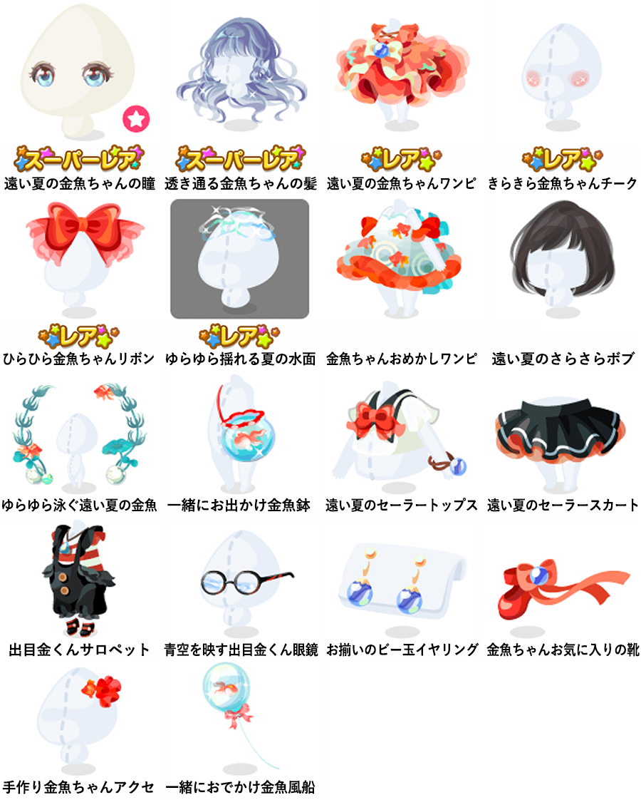 ★遠い夏の金魚ちゃんの瞳(顔パーツ) ★透き通る金魚ちゃんの髪 ☆遠い夏の金魚ちゃんワンピ(アクション付きfアイテム) ☆きらきら金魚ちゃんチーク ☆ひらひら金魚ちゃんリボン ☆ゆらゆら揺れる夏の水面 金魚ちゃんおめかしワンピ 遠い夏のさらさらボブ ゆらゆら泳ぐ遠い夏の金魚 一緒にお出かけ金魚鉢 遠い夏のセーラートップス 遠い夏のセーラースカート 出目金くんサロペット 青空を映す出目金くん眼鏡 お揃いのビー玉イヤリング 金魚ちゃんお気に入りの靴 手作り金魚ちゃんアクセ 一緒におでかけ金魚風船