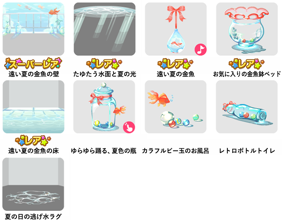 ★遠い夏の金魚の壁 ☆たゆたう水面と夏の光 ☆遠い夏の金魚(ネイロアイテム) ☆お気に入りの金魚鉢ベッド ☆遠い夏の金魚の床 ゆらゆら踊る、夏色の瓶(アクションアイテム) カラフルビー玉のお風呂 レトロボトルトイレ 夏の日の逃げ水ラグ