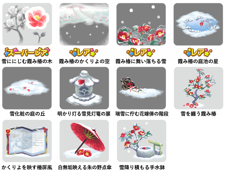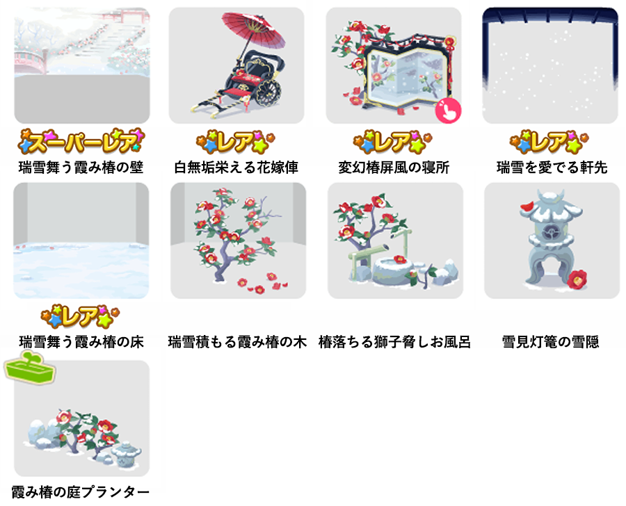 ★瑞雪舞う霞み椿の壁 ☆白無垢栄える花嫁俥 ☆変幻椿屏風の寝所(アクションアイテム) ☆瑞雪を愛でる軒先 ☆瑞雪舞う霞み椿の床 瑞雪積もる霞み椿の木 椿落ちる獅子脅しお風呂 雪見灯篭の雪隠 霞み椿の庭プランター