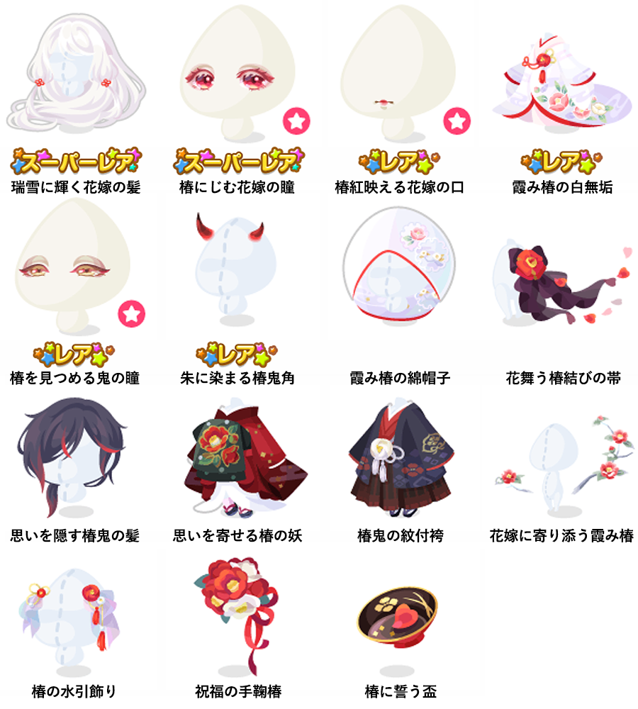 ★瑞雪に輝く花嫁の髪 ★椿にじむ花嫁の瞳(顔パーツ) ☆椿紅映える花嫁の口(顔パーツ) ☆霞み椿の白無垢 ☆椿を見つめる鬼の瞳(顔パーツ) ☆朱に染まる椿鬼角 霞み椿の綿帽子 花舞う椿結びの帯 思いを隠す椿鬼の髪 思いを寄せる椿の妖 椿鬼の紋付袴 花嫁に寄り添う霞み椿 椿の水引飾り 祝福の手鞠椿 椿に誓う盃