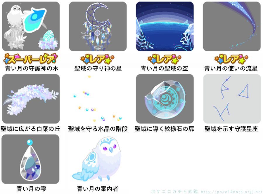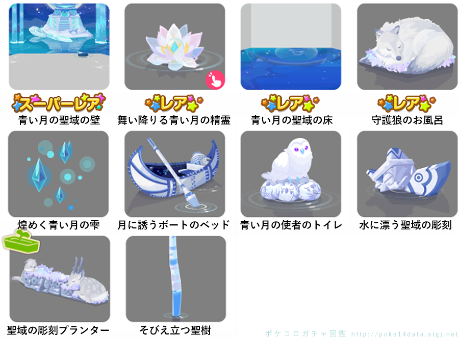 ★青い月の聖域の壁 ☆舞い降りる青い月の精霊(アクションアイテム) ☆青い月の聖域の床 ☆守護狼のお風呂 煌めく青い月の雫 月に誘うボートのベッド 青い月の使者のトイレ 水に漂う聖域の彫刻 聖域の彫刻プランター そびえ立つ聖樹