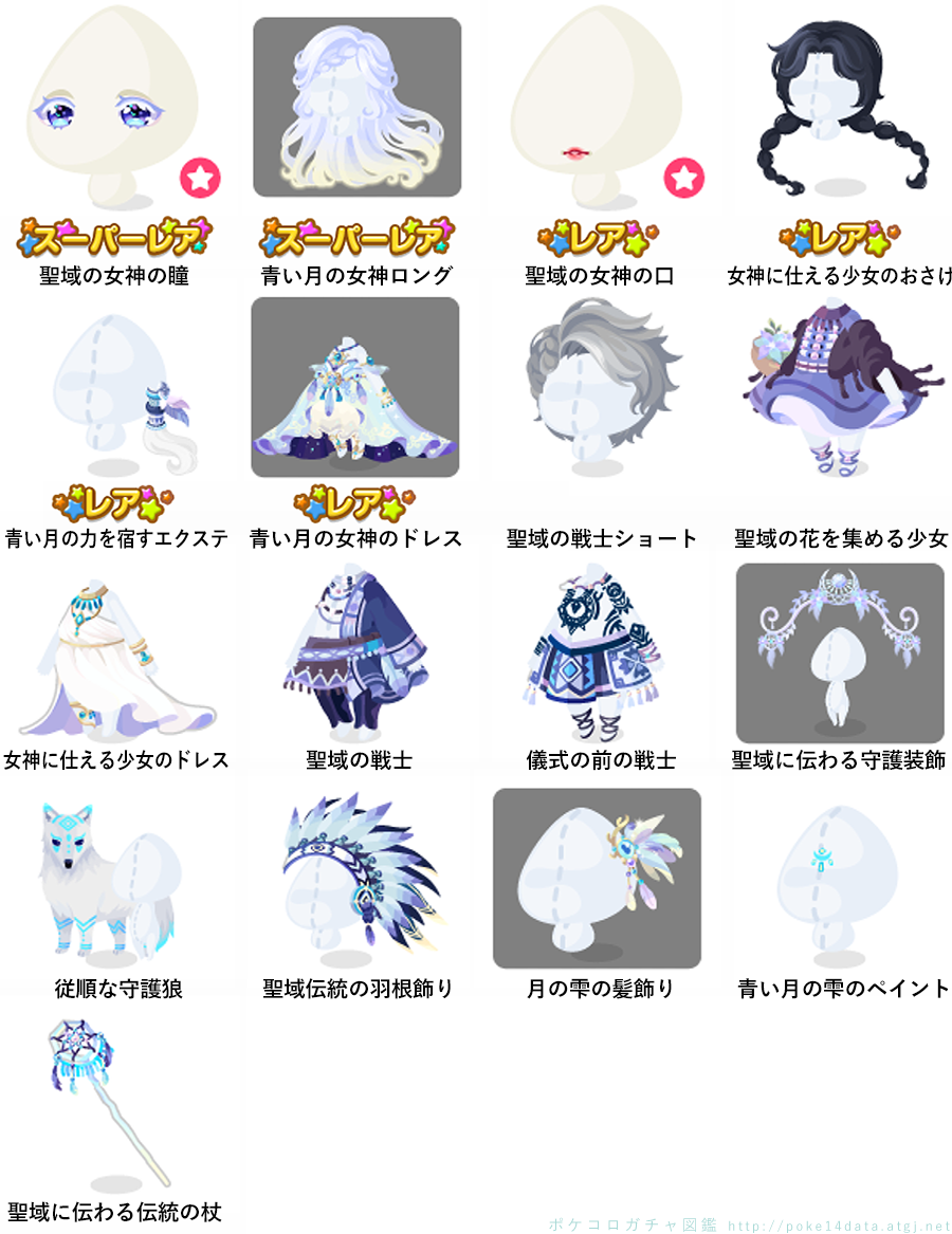 ★聖域の女神の瞳(顔パーツ) ★青い月の女神ロング ☆聖域の女神の口(顔パーツ) ☆女神に仕える少女のおさげ ☆青い月の力を宿すエクステ ☆青い月の女神のドレス 聖域の戦士ショート 聖域の花を集める少女 女神に仕える少女のドレス 聖域の戦士 儀式の前の戦士 聖域に伝わる守護装飾 従順な守護狼 聖域伝統の羽根飾り 月の雫の髪飾り 青い月の雫のペイント 聖域に伝わる伝統の杖