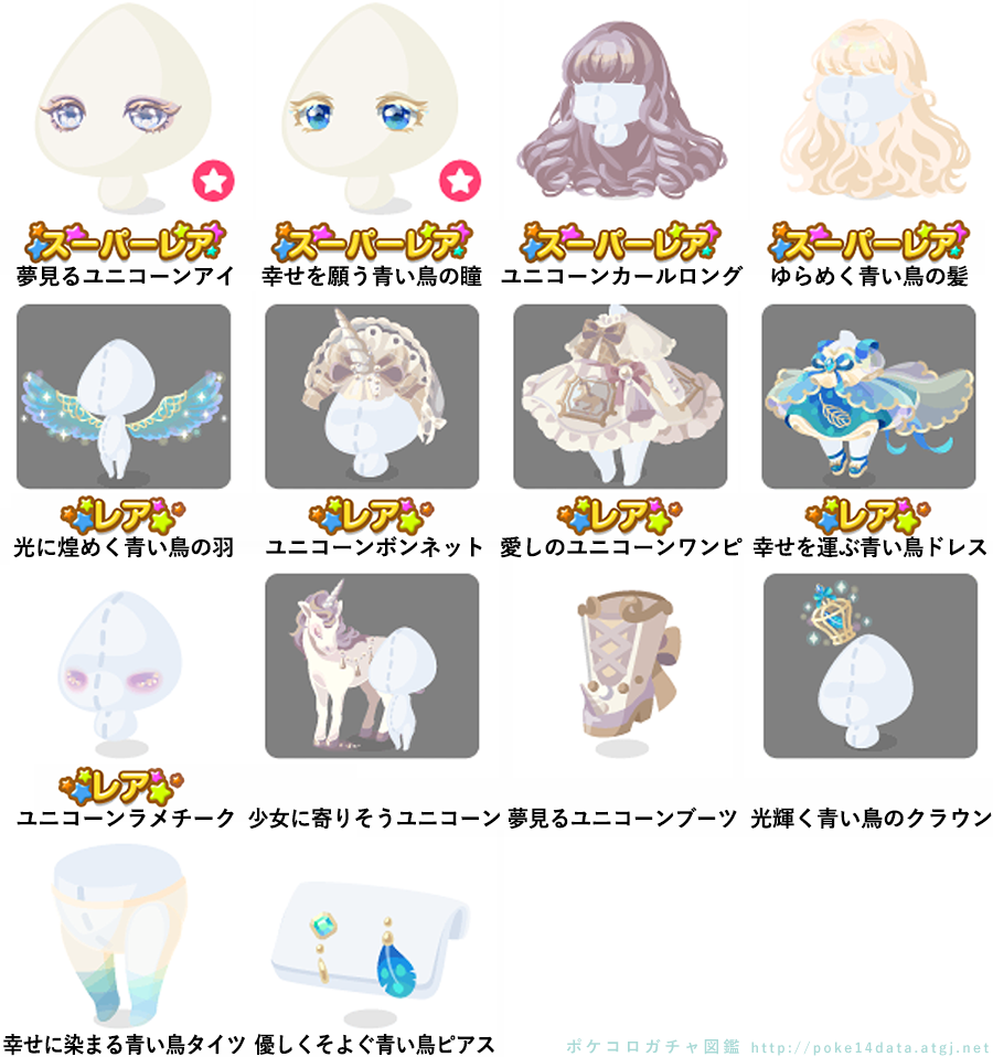 ★夢見るユニコーンアイ(顔パーツ) ★幸せを願う青い鳥の瞳(顔パーツ) ★ユニコーンカールロング ★ゆらめく青い鳥の髪 ☆光に煌めく青い鳥の羽 ☆ユニコーンボンネット ☆愛しのユニコーンワンピ ☆幸せを運ぶ青い鳥ドレス(アクション付きfアイテム) ☆ユニコーンラメチーク 少女に寄りそうユニコーン 夢見るユニコーンブーツ 光輝く青い鳥のクラウン 幸せに染まる青い鳥タイツ 優しくそよぐ青い鳥ピアス