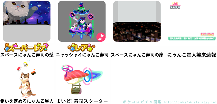 ★スペースにゃんこ寿司の壁 ☆ニャッシャイにゃんこ寿司(ネイロアイテム) スペースにゃんこ寿司の床 にゃんこ星人襲来速報 狙いを定めるにゃんこ星人 まいど!寿司スクーター