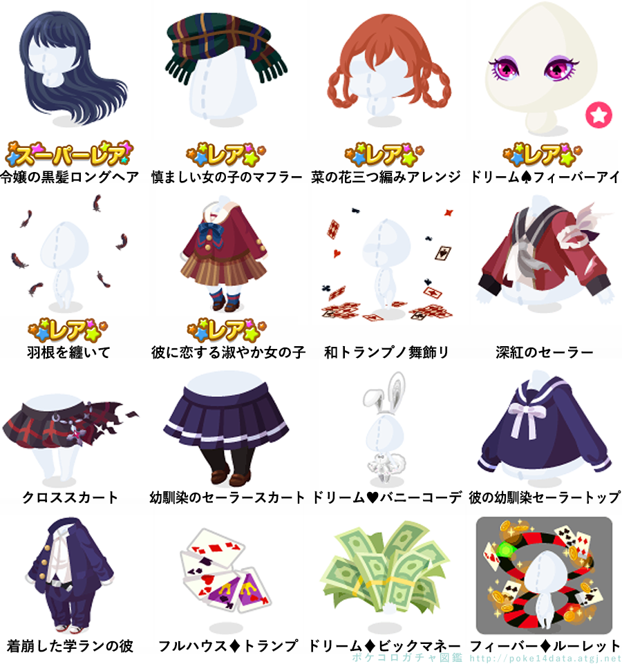 ★令嬢の黒髪ロングヘア ☆慎ましい女の子のマフラー ☆菜の花三つ編みアレンジ ☆ドリーム♠フィーバーアイ(顔パーツ) ☆羽根を纏いて ☆彼に恋する淑やか女の子 和トランプノ舞飾リ 深紅のセーラー クロススカート 幼馴染のセーラースカート ドリーム♥バニーコーデ 彼の幼馴染セーラートップ 着崩した学ランの彼 フルハウス♦トランプ ドリーム♦ビックマネー フィーバー♦ルーレット