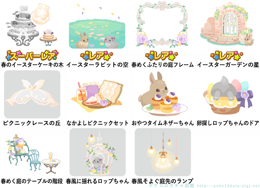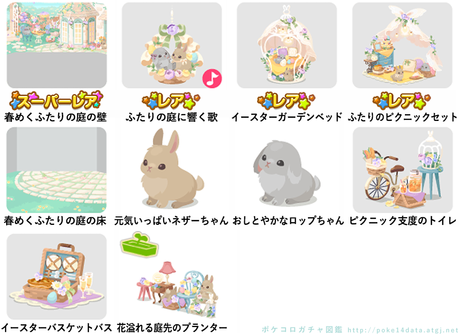 ★春めくふたりの庭の壁 ☆ふたりの庭に響く歌(ネイロアイテム) ☆イースターガーデンベッド ☆ふたりのピクニックセット 春めくふたりの庭の床 元気いっぱいネザーちゃん おしとやかなロップちゃん ピクニック支度のトイレ イースターバスケットバス 花溢れる庭先のプランター