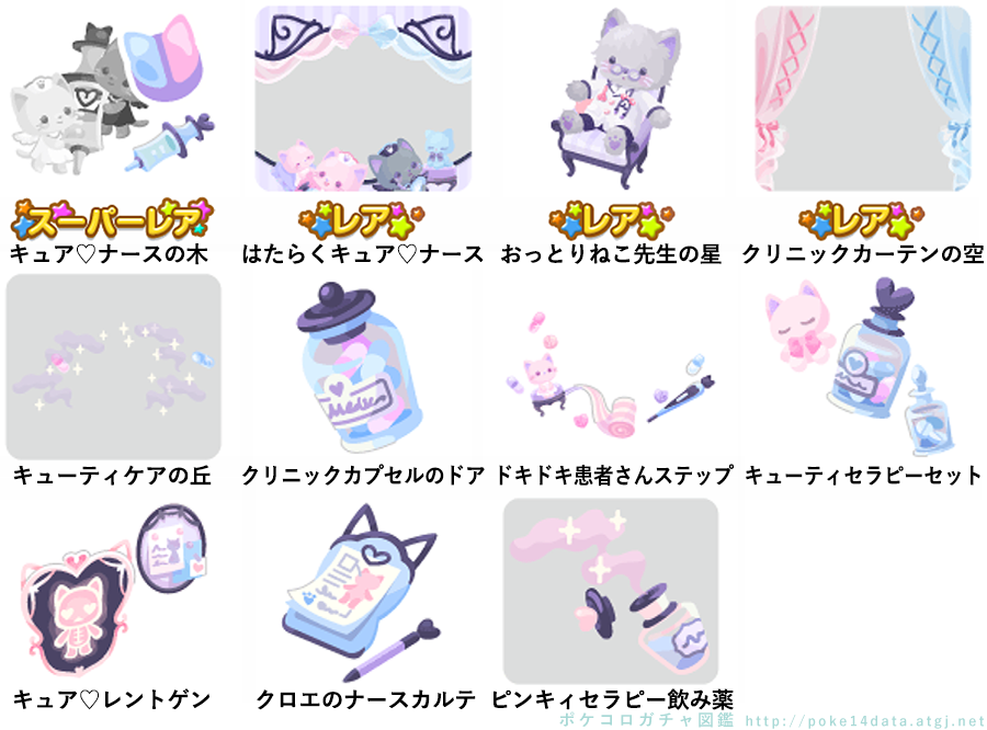 ★キャット♡クリニックの壁 ☆キュア♡ステーション(ネイロアイテム) ☆ナデナデねこ先生チェア(アクションアイテム) ☆ピンキィセラピーベッド キャット♡クリニックの床 クロエのレントゲンバス キューティケアトイレ やさしいキュア♡ピンキィ いやしのキュア♡クロエ クリニックプランター