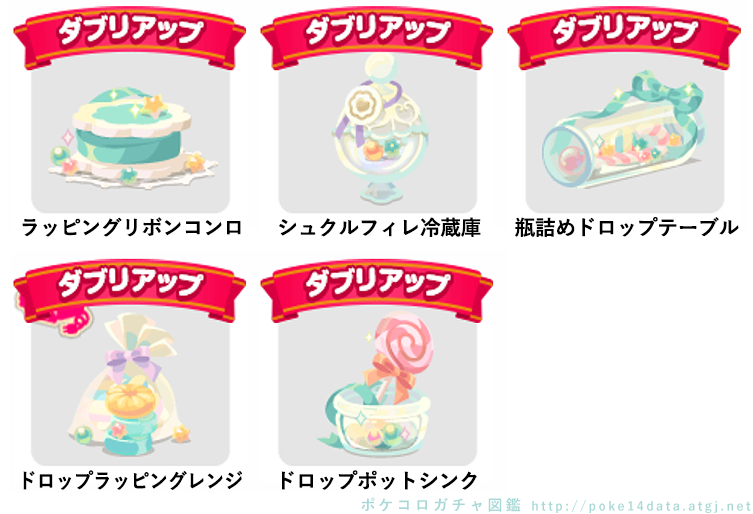 ラッピングリボンコンロ こぼれた小さなドロップ③ふかふかなマシュマロ③ シュクルフィレ冷蔵庫 シュクルフィレパラソル③ 瓶詰めドロップテーブル 瓶詰めドロッププランター③ ドロップラッピングレンジ 甘いキャンディはいかが?③ こぼれた思い出のドロップ③ ドロップポットシンク 思いを込めて包むの