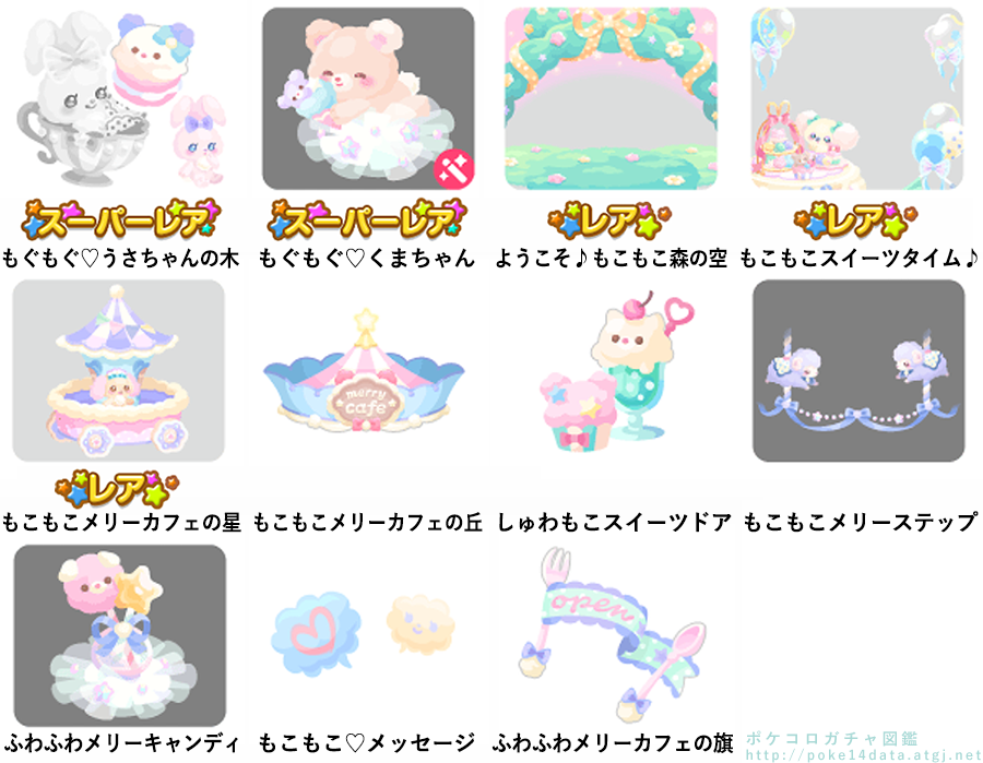 ★もぐもぐ♡うさちゃんの木 No.1312 もこもこおにぎりプレート もこもこスイーツの実 ★もぐもぐ♡くまちゃん(フィルターアイテム) ☆ようこそ♪もこもこ森の空 ☆もこもこスイーツタイム♪ ☆もこもこメリーカフェの星 もこもこメリーカフェの丘 しゅわもこスイーツドア もこもこメリーステップ ふわふわメリーキャンディ もこもこ♡メッセージ ふわふわメリーカフェの旗
