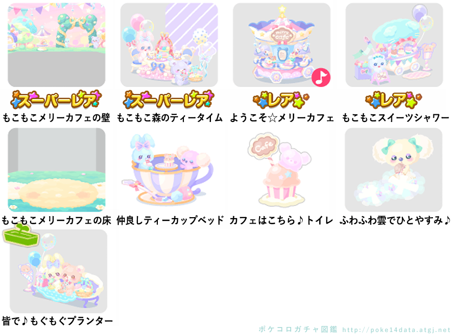 ★もこもこメリーカフェの壁 ★もこもこ森のティータイム(パターンアイテム) ☆ようこそ☆メリーカフェ(ネイロアイテム) ☆もこもこスイーツシャワー もこもこメリーカフェの床 仲良しティーカップベッド カフェはこちら♪トイレ ふわふわ雲でひとやすみ♪ 皆で♪もぐもぐプランター