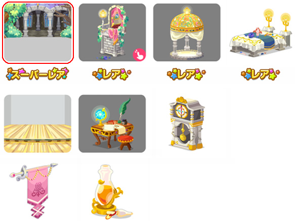 ★語り継がれる悲恋の壁 ☆愛を育む窓際の逢瀬(アクションアイテム) ☆二人の秘密の結婚式 ☆永遠に寄り添うベッド 悲恋の舞台の床 戯曲が生まれる創造の机 約束の9時を知らせる時計 両家の誇りの紋章旗 一縷の希望を秘めた小瓶