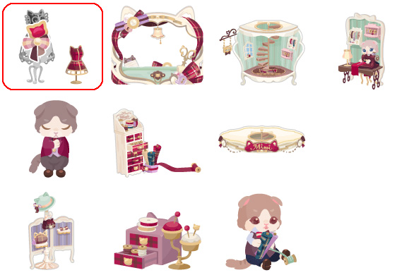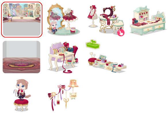★オートクチュールの壁 ☆大きなミロワールバス ☆ミミのマシンナ・クードル(アクションアイテム) ☆テイラーの作業机ベッド オートクチュールの床 リュバンの作業台トイレ クチュールプランター ベテランテイラー・レグル リュバンデコール