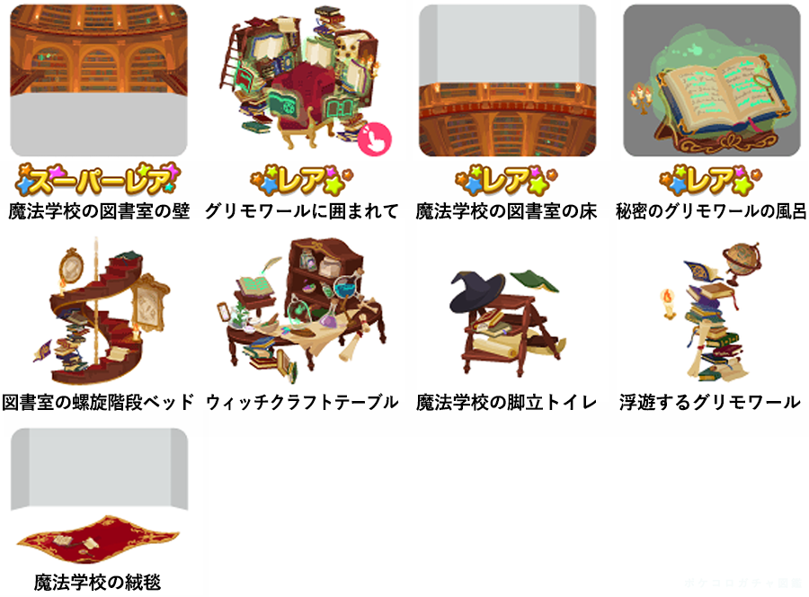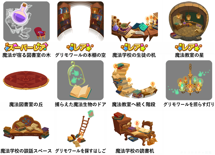 ★魔法が宿る図書室の木 No.881 魔法秘薬ドリンク魔法秘薬の原料の実 ☆グリモワールの本棚の空 ☆魔法学校の生徒の机 ☆魔法教室の星 魔法図書室の丘 捕らえた魔法生物のドア 魔法教室へ続く階段 グリモワールを照らす灯り 魔法学校の談話スペース グリモワールを探すはしご 魔法学校の読書机