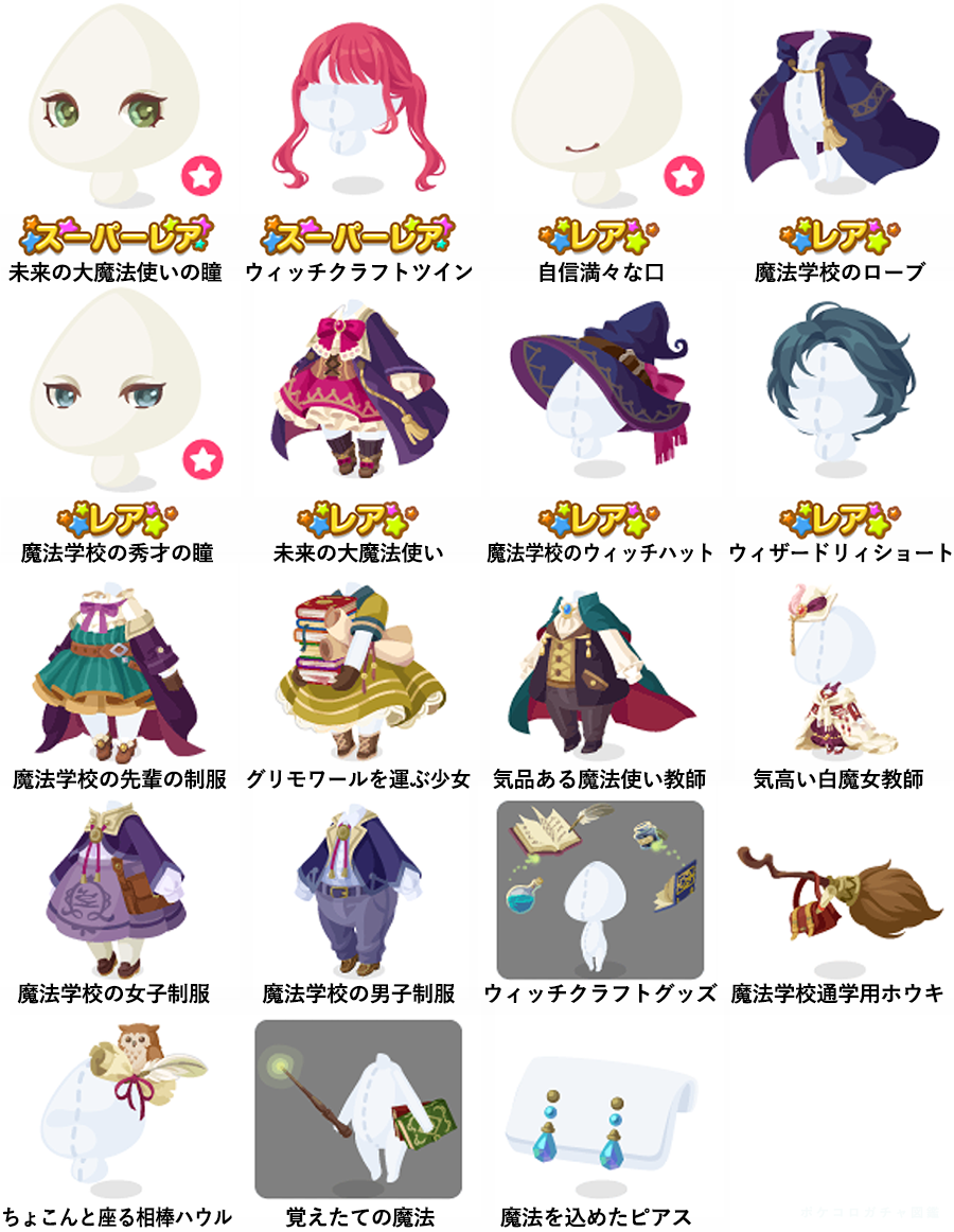★未来の大魔法使いの瞳(顔パーツ) ★ウィッチクラフトツイン ☆自信満々な口(顔パーツ) ☆魔法学校のローブ ☆魔法学校の秀才の瞳(顔パーツ) ☆未来の大魔法使い ☆魔法学校のウィッチハット ☆ウィザードリィショート 魔法学校の先輩の制服 グリモワールを運ぶ少女 気品ある魔法使い教師 気高い白魔女教師 魔法学校の女子制服 魔法学校の男子制服 ウィッチクラフトグッズ 魔法学校通学用ホウキ ちょこんと座る相棒ハウル 覚えたての魔法 魔法を込めたピアス