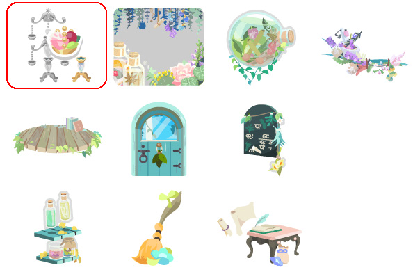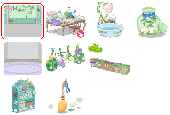 ★魔女の研究室の壁 ☆ハーブ調合デスクベッド(アクションアイテム) ☆朝露シャワーの陶器風呂 ☆若草色のガラス製トイレ 魔女の研究室の床 優しい香りの吊るしハーブ ハーブストックプランター 研究道具たちの集合棚 お掃除大好きマジカル箒