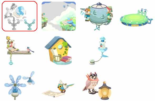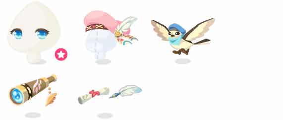 ☆蒼空を見つめる研究者の瞳(顔パーツ) 研究者の羽飾りベレー まじめな指導係の小鳥 風を見透す望遠鏡 愛用の風車設計道具