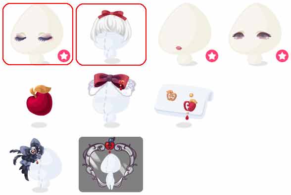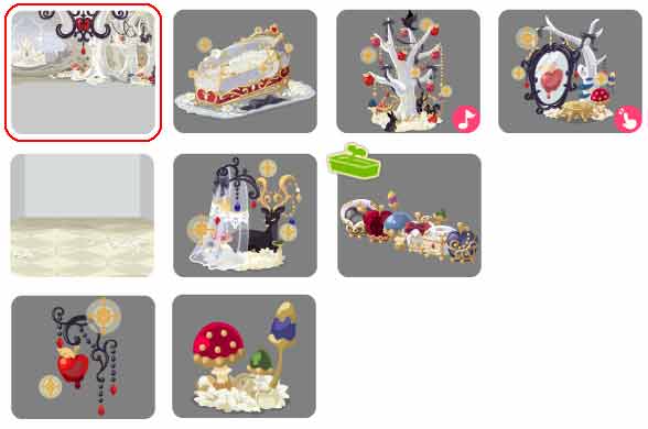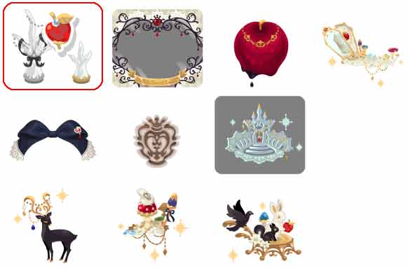 ★白雪姫と甘い毒の壁 ☆幸福を夢見る硝子の棺 ☆甘い毒林檎の誘惑(ネイロアイテム) ☆映してミラー・ミラー(アクションアイテム) 白雪姫と甘い毒の床 黒き宝飾のディアー・バス 美しいものは全て欲しいの 毒林檎の成れの果て 森の中の夢まぼろし