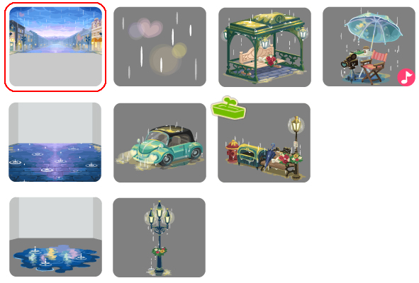 ★シルヴィーと雨の街の壁 ☆夕立と街明かりの光 ☆約束の停留所ベッド ☆雨が見せる世界(ネイロアイテム) シルヴィーと雨の街の床 雨を照らす車のお風呂 名シーンプランター 映り込む光と水たまり 雨に打たれる街灯
