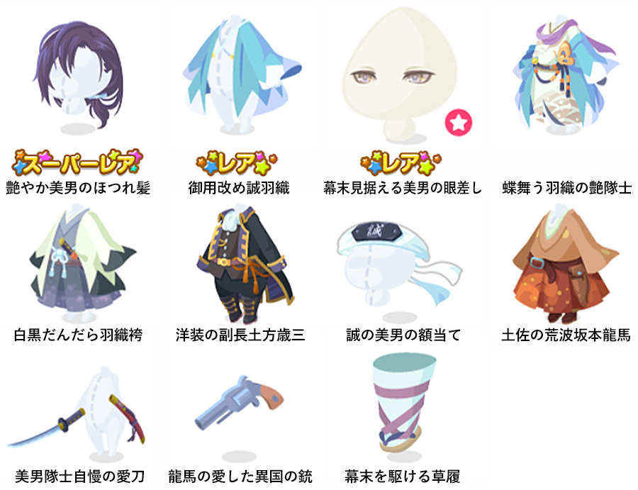 ★艶やか美男のほつれ髪 ☆御用改め誠羽織 ☆幕末見据える美男の眼差し(顔パーツ) 蝶舞う羽織の艶隊士 白黒だんだら羽織袴 洋装の副長土方歳三 誠の美男の額当て 土佐の荒波坂本龍馬 美男隊士自慢の愛刀 龍馬の愛した異国の銃 幕末を駆ける草履